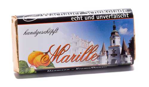 Dunkle Schokolade mit alkoholfreier Marillenfüllung.
